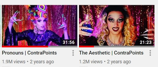 In both The Aesthetic and Pronouns, Natalie Wynn discusses ideas concerning the communication of gender and argument, but from different perspectives. She presents these perspectives through the formats of the texts, through dialogue in The Aesthetic and direct argumentation in Pronouns, and communicates different ideas through her costumes and set designs. It's this intricate composition of communication styles that draws in and persuades Wynn's audience.