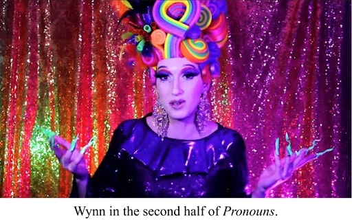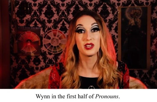 In Pronouns, Wynn rebuts conservative commentator Ben Shapiro's argument that the usage of personal pronouns should be dictated by sex chromosomes. In the first half of the video, Wynn argues that one's pronouns should be largely determined by one's gendered social role. Wynn recounts her own experiences as a transwoman, and how, without telling others that she prefers “she/her” pronouns, most people refer to her as a woman anyway (Wynn, 00:06:47-00:06:53). The social role of a woman doesn't concern having specific chromosomes, but instead exhibiting the appearance, gestures, and aura typically associated with women. Thus, cisgender and transgender women effectively exhibiting these characteristics are treated the same in most social contexts. In the second half of the video, Wynn examines the relationship that psychological experience should have on pronoun usage. She discusses the performance of drag to illustrate her argument that presentation alone doesn't tell the whole story behind someone's identity (Wynn, 00:22:00-00:22:07). Some drag queens view drag as an essential part of communicating their identities, while others view drag as costumes for entertainment and nothing more. Accordingly, queens prefer different pronouns to reflect their identities, not their presentation. Wynn argues society should acknowledge others' psychological realities by using their preferred pronouns (Wynn, 00:24:21-00:24:32).