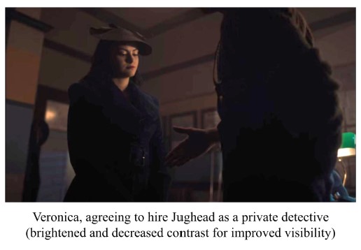 Jughead's vast knowledge of literature and cinema allows him to connect with various characters and archetypes. For example, in season three, Veronica asks to hire Jughead to figure out who shot her father. Jughead accepts the offer, saying, “Well then, consider me your Philip Marlowe,” an allusion to the film noir private detective (“The Red Dahlia” 6:34). In the same scene, Jughead quips, “Nice hat, Bacall,” referring to the actress who stars in the 1946 film The Big Sleep, featuring Philip Marlowe (“The Red Dahlia” 5:39). In fact, despite not being in black and white — that might be a little too on the nose — the entire scene is directed like film noir, from the moody lighting to the jazz music to the subtle downpour. This ambiance makes the audience ponder if the dress and demeanor of a character from a film noir would be consistent with Veronica's disposition and knowledge. The scene could be purely a stylistic choice by the directors, but it seems more likely that the scene, or even the entire series, is told through Jughead's point of view and both the plot and non-plot elements reflect his desired distortions of reality and himself.